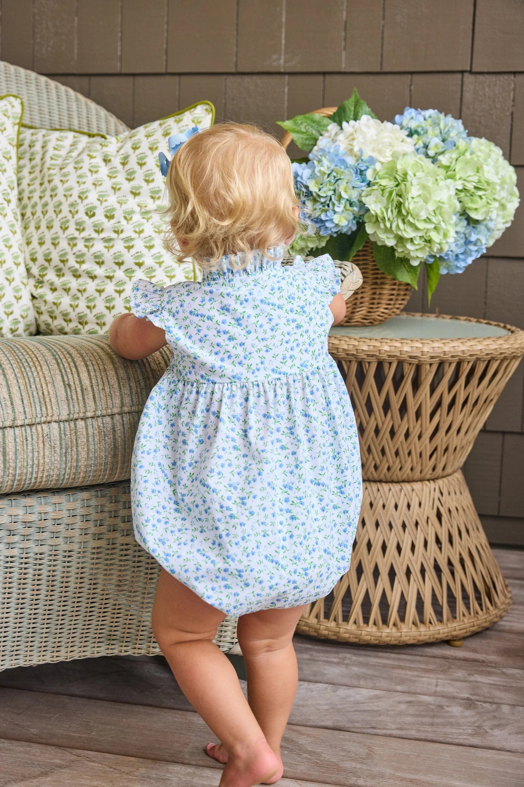 Celebrate the season in this charming Mayfair Floral Birdie Bubble, where spring blooms in shades of blue and green. Designed for little ones who love classic style, this baby girl bubble features delightful gathers at the waist and ruffled details along the collar, placket, and flutter sleeves. Ideal for spring outings and family portraits, it pairs beautifully with our coordinating Birdie Dress for big sister. Mix and match pieces from the Mayfair Collection to dress the whole crew in coordinated spring elegance.