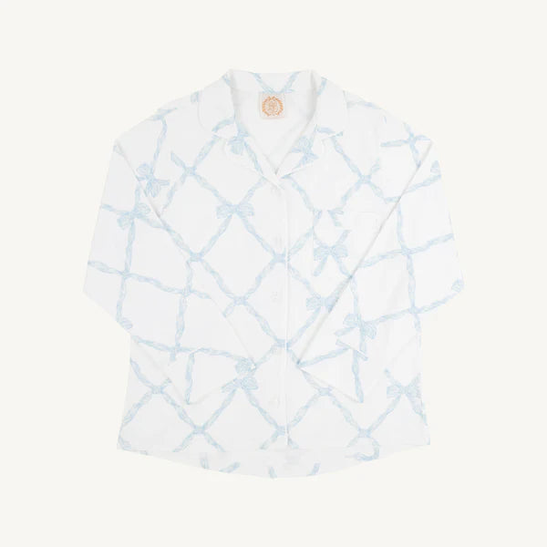 The Let Me Lounge Long Sleeve Top in Buckhead Blue Belle Meade Bow is a cozy essential that brings signature style to your relaxation routine. This versatile pajama top features our beloved bow print and soft fabric that's perfect for matching with your littles, bridesmaid's gifts, lazy mornings and everything in between. An essential piece that pairs beautifully with the coordinating Let Me Lounge Bottoms!