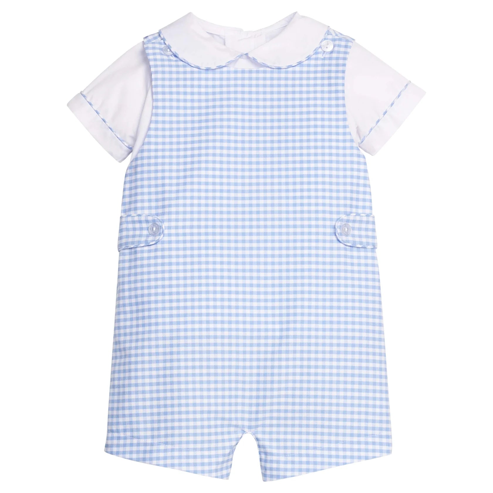 Dress your little one in timeless charm with this delightful John John set! Featuring a crisp white woven peter pan collar shirt paired with a charming gingham John John, it's the perfect ensemble for special moments—whether you're celebrating Easter or capturing precious family memories. The classic silhouette feels both sophisticated and fun, and with our coordinating Mayfair Collection pieces, creating matching sibling looks has never been easier. A wardrobe essential that brings joy to every occasion!
