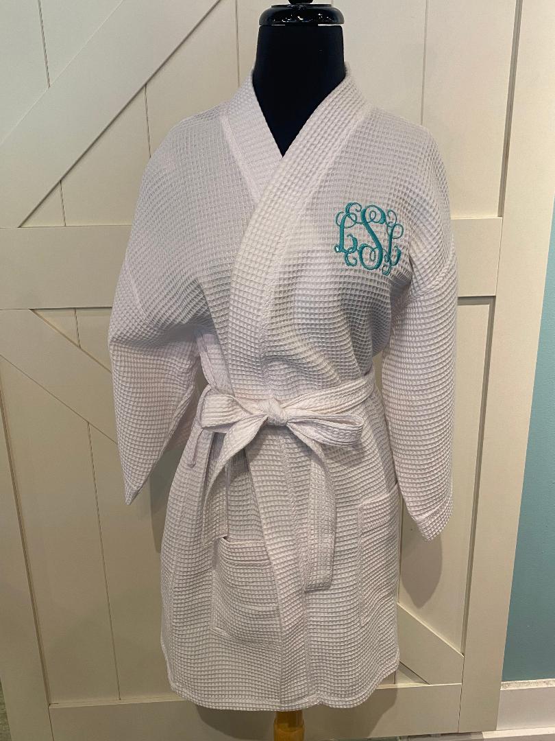 This white monogrammed waffle kimono robe is the absolute perfect personalized graduation, bridesmaid or "just because" gift. She will love lounging around in this soft, knee length robe. Available in white, light pink, hot pink, turquoise, navy and Caribbean green.