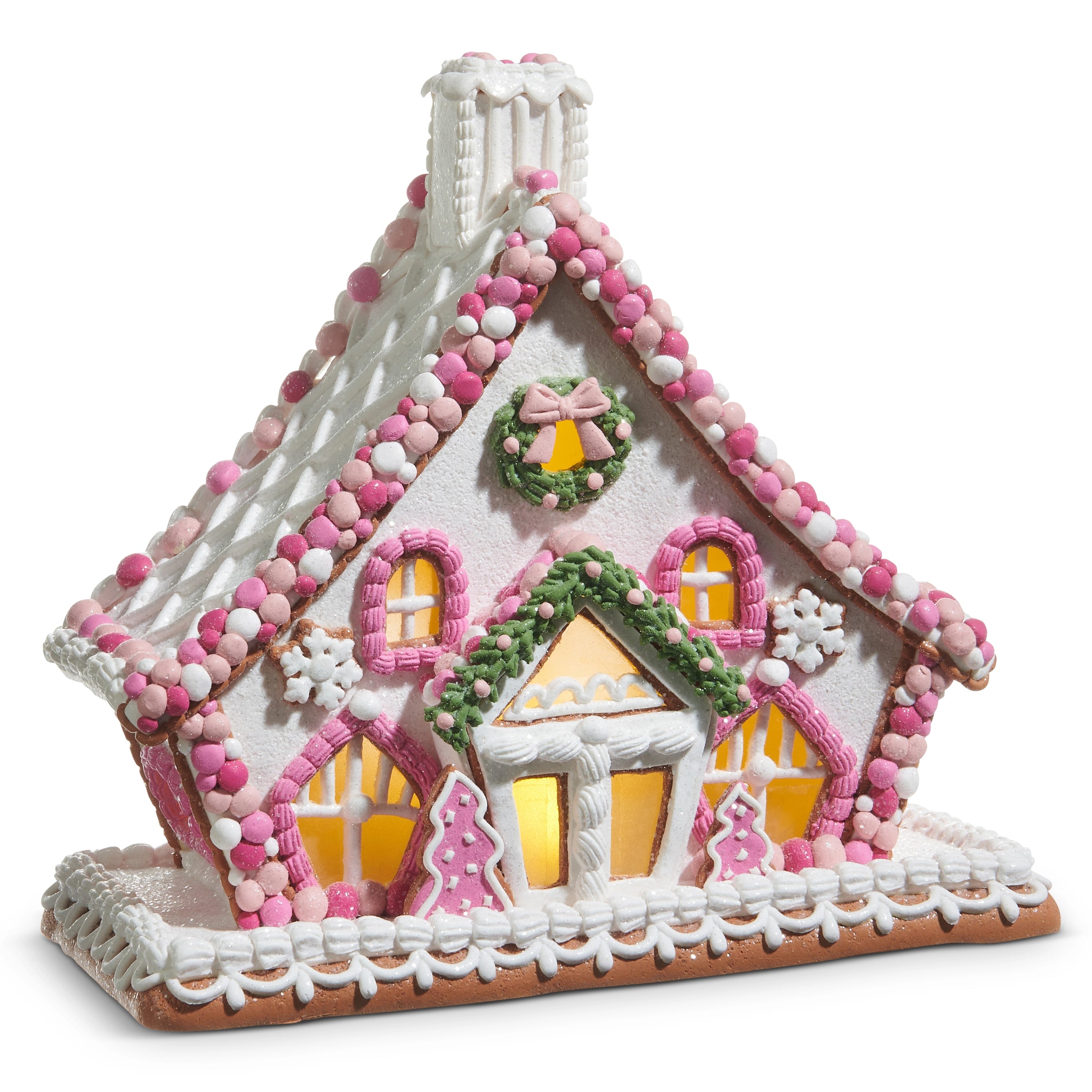 Bring a sweet glow to any room with this 11.5" Pink Ball Garland Lighted Gingerbread House. Crafted from charming clay dough, it measures a cozy 11.5" by 6.58" by 10.75" and features a playful lighted garland. Powered by 3 AA batteries, it offers a smart 6-hour timer that repeats every 18 hours—perfect for hassle-free festive ambiance. Add this delightful piece to brighten your space with whimsical charm!