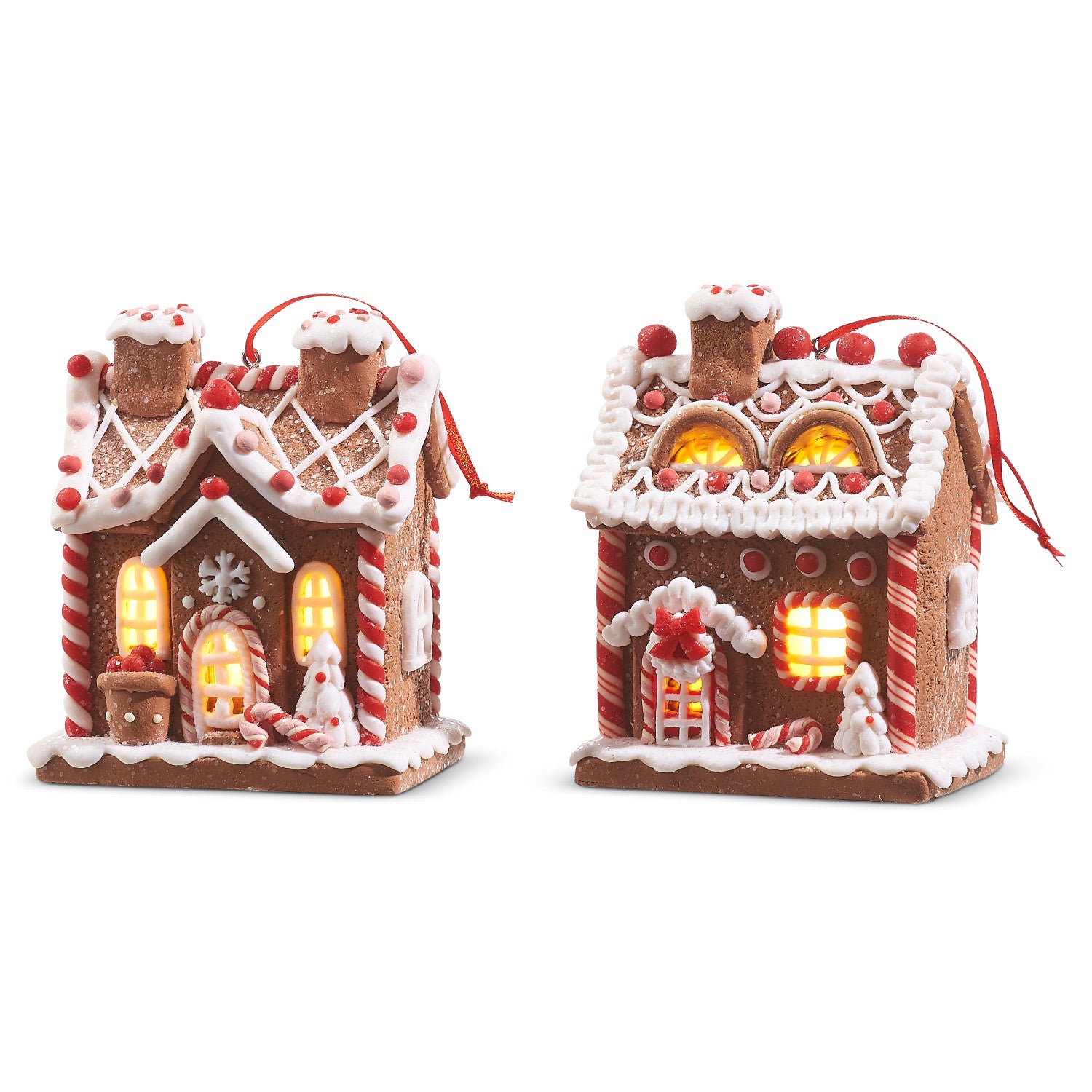 Add a little holiday sparkle with this charming 5" Lighted Gingerbread Ornament! Crafted from claydough and decorated with white icing, red and white peppermint candies, plus a snowy dusting, it brings festive cheer to any space. The tiny glowing house runs on included batteries with a 6-hour timer that repeats every 18 hours—effortless magic for your holiday decor. Each sold separately, it's the perfect playful touch for your seasonal display.