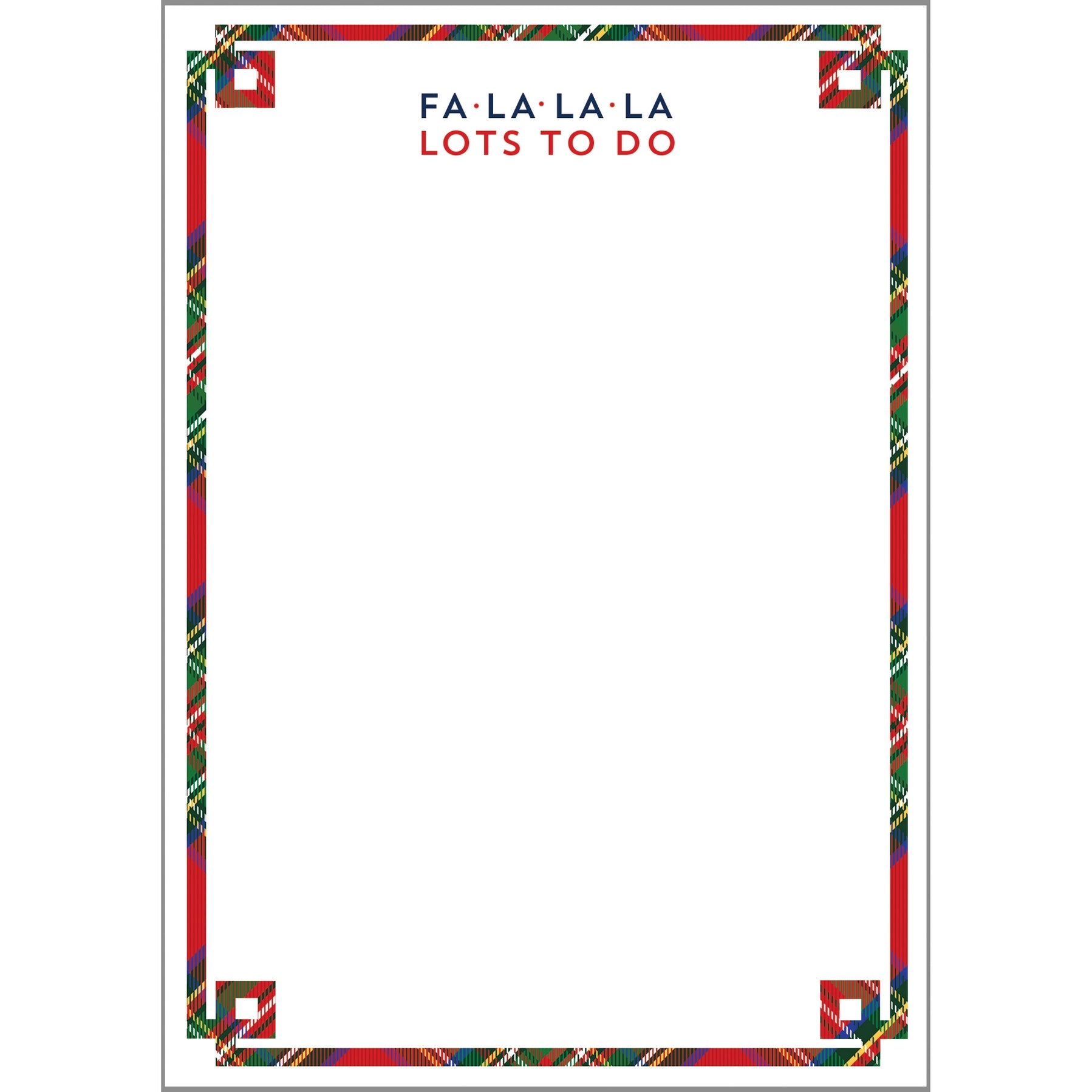 Stay organized in style with the 5x7 Fa La La Lots To Do Notepad! Printed on bright white 70# paper, each page pops with vivid color to keep your to-dos festive and fun. With 100 pages packed inside, you'll have plenty of space to jot down all your holiday plans. Delivered in a clear cellophane bag with a branded band, it’s the perfect playful companion for your busy season.