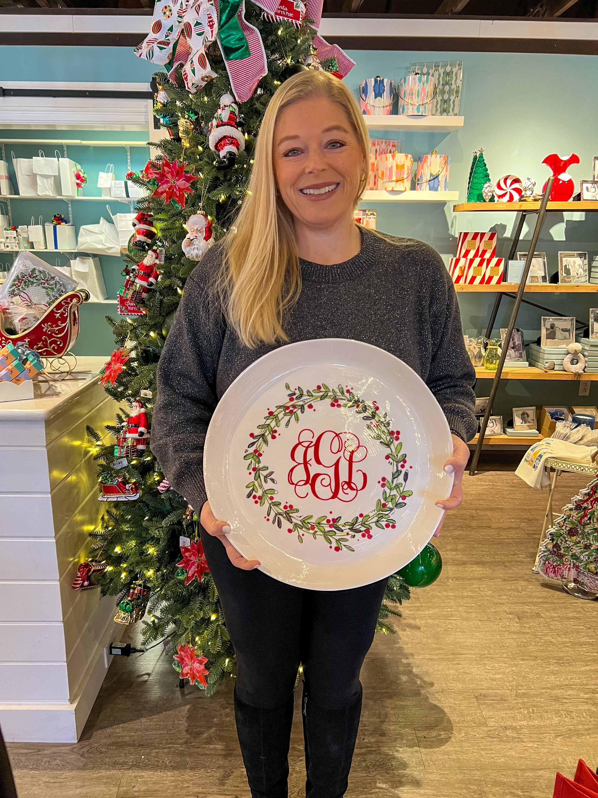 Get ready to sleigh your holiday entertaining game with our festive Large Christmas Serving Tray featuring Relish's iconic wreath design. Let us personalize it! We recommend a monogram in red in either Vine Interlock font as shown, or Bold Block.