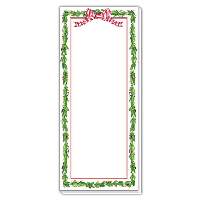 Stay organized in style with the Holly w/ Berries & Red Striped Bow Skinny Notepad. Slim and sleek, this 3.5 x 8.25" pad holds 40 sheets of sturdy 90# paper—perfect for those endless shopping lists, market finds, or quick notes. Its charming holiday design adds a festive touch to every task, making list-making feel like a breeze!