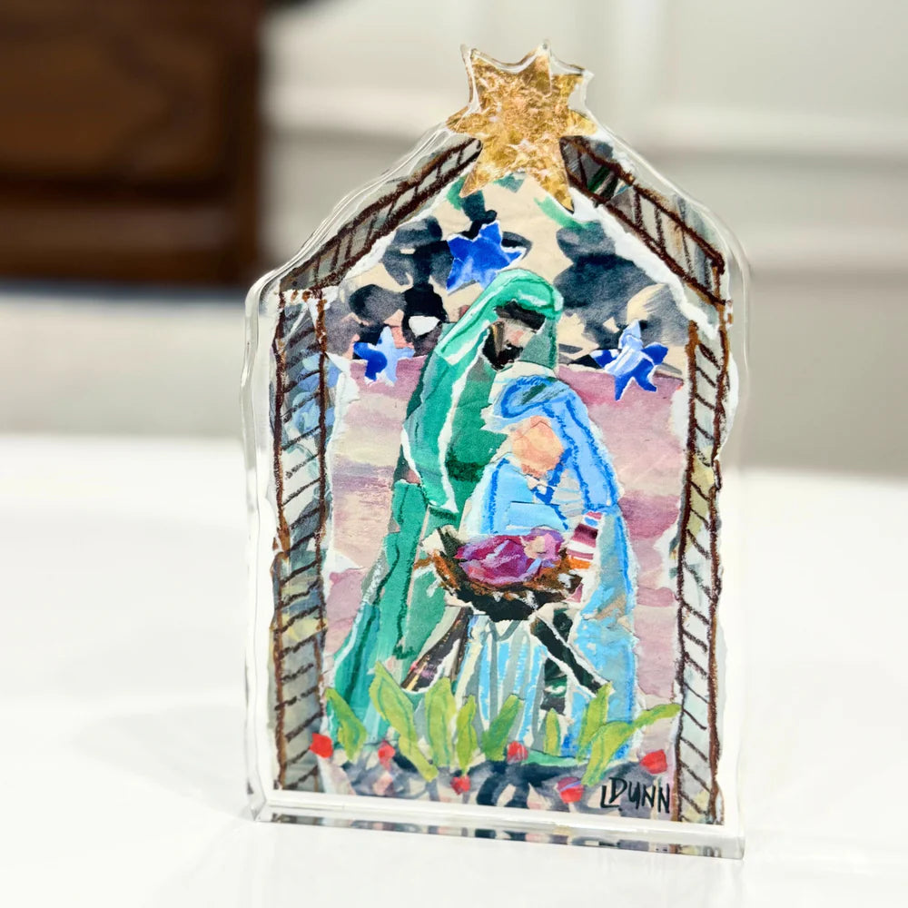 A beautiful silhouette of Mary, Joseph, and baby Jesus printed on crystal-clear acrylic. This standalone piece features vibrant, long-lasting ink and catches light beautifully on any shelf or mantel. A modern way to celebrate the nativity story.