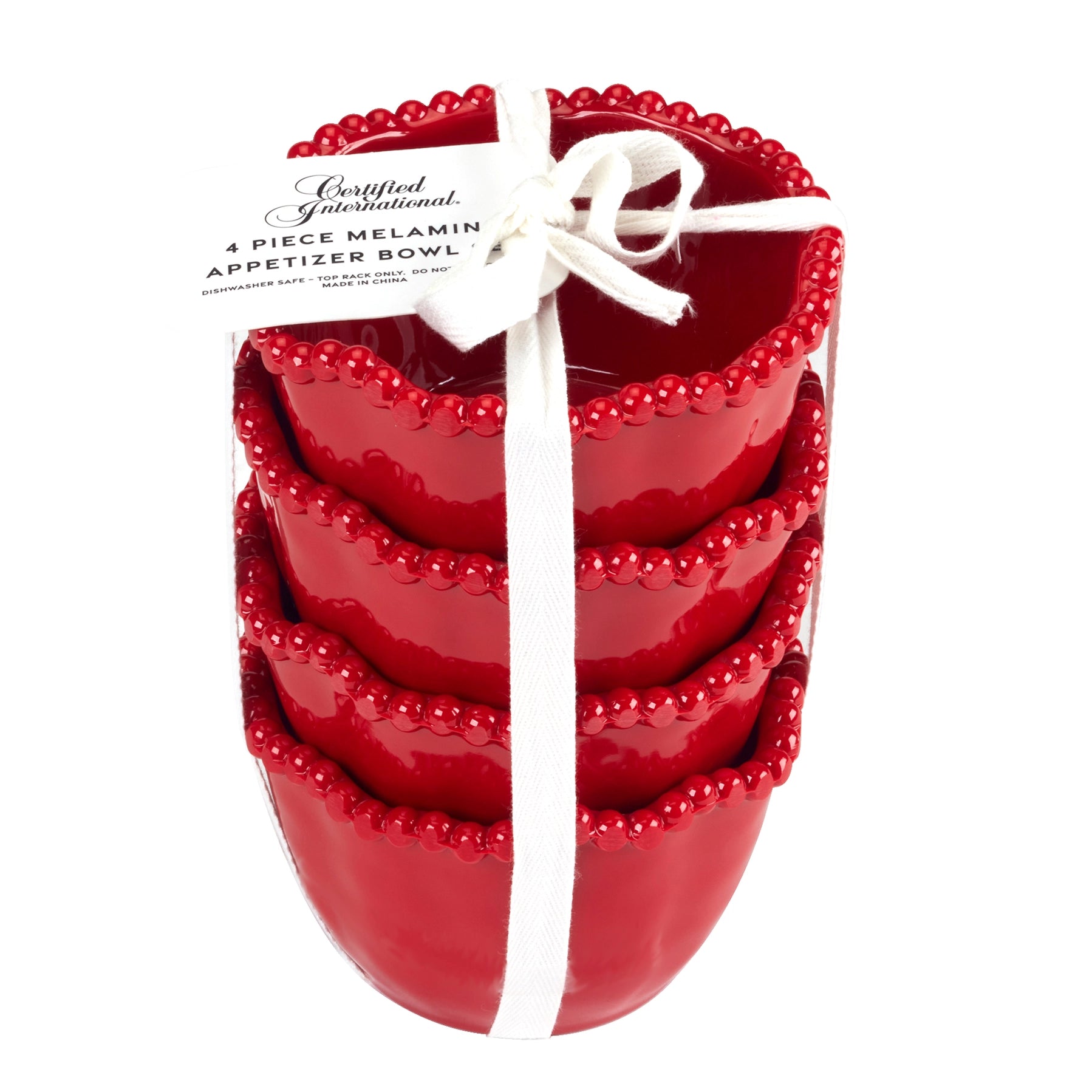 Serve your dips in style with the Perlette Red Set of 4 Dipping Bowls. Bright red with a fun beaded edge, these 4.625-inch bowls come tied with a cute white ribbon—perfect for gifting or your own kitchen. Made from tough melamine, they resist chips and cracks, and cleanup is simple since they’re dishwasher safe. Add a pop of color and charm to any table with these lively bowls!