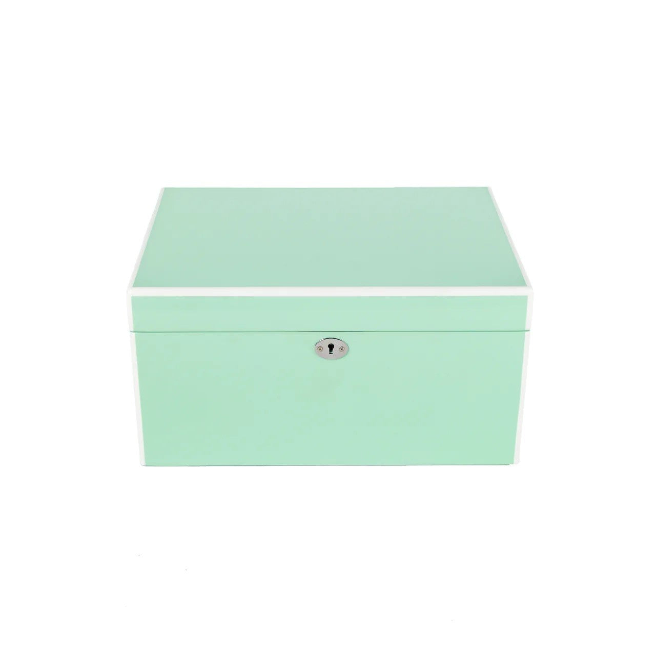 This beautiful jewelry box is a sophisticated way to stash away jewelry, keepsakes and other knickknacks. The box Includes two pull out organization trays. Made of wood and High Gloss Lacquer finish with interior lining. Beautiful mint color with white trim.
