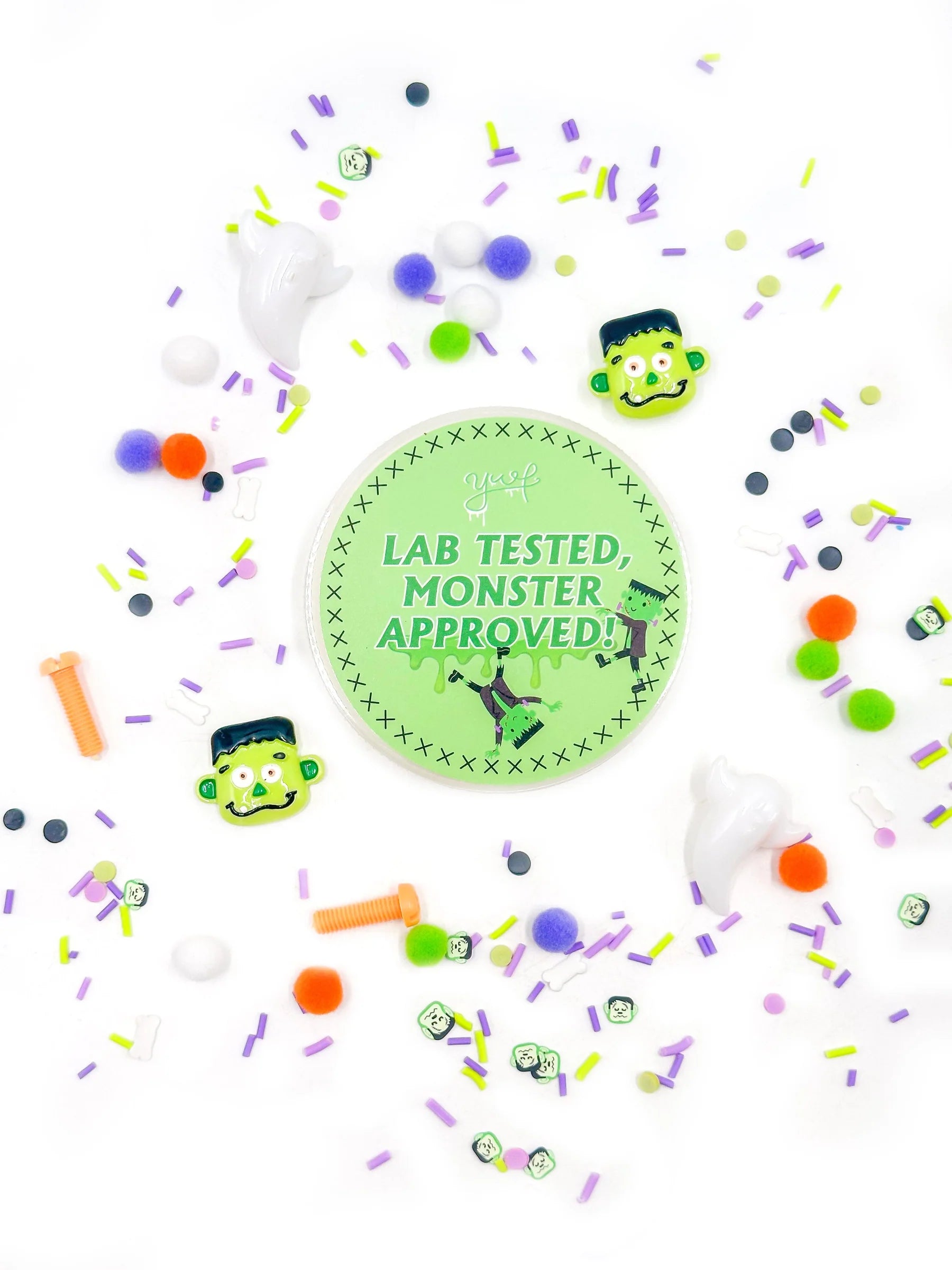 Frankenslime is a gooey green slime with a watermelon scent and packed with spooky mix-ins. Add tiny foam beads, white acrylic ghosts, nuts and bolts, googly eyes, and Frankenstein charms to bring your monster to life.