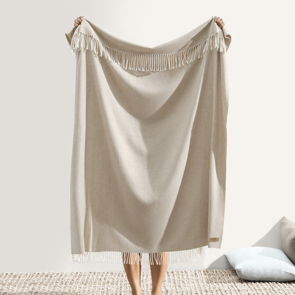 This Italian herringbone throw in Dune from Lands Downunder is cashmere-soft and sophisticated with fresh white decorative fringe. Known for its light weight versatility, this four-season accent throw makes it the perfect addition to bedrooms and living spaces.