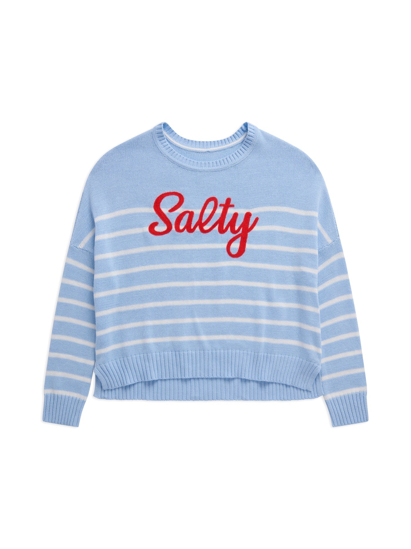 Embrace your inner beach bum with this Blue Salty Relaxed Fit Sweater—a laid-back essential that channels effortless coastal vibes. Adorned with witty graphics and timeless striping, this pullover delivers personality with a wink and a smile. The lightweight knit fabric and roomy drop-shoulder cut create that coveted slouchy silhouette, making it your go-to for everything from seaside strolls to cozy nights in. Whether you're channeling nautical nostalgia or just craving comfort with character, this sweater is ready to become your new favorite.